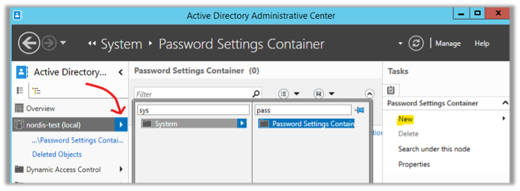 Bunu yapmak için Active Directory Administrative Center açılır ve sol taraftan domain seçilerek System > Password Settings Container bölümüne gelinir. Ardından sağ taraftan New > Password Settings kısmından tanımlamalar yapılır.