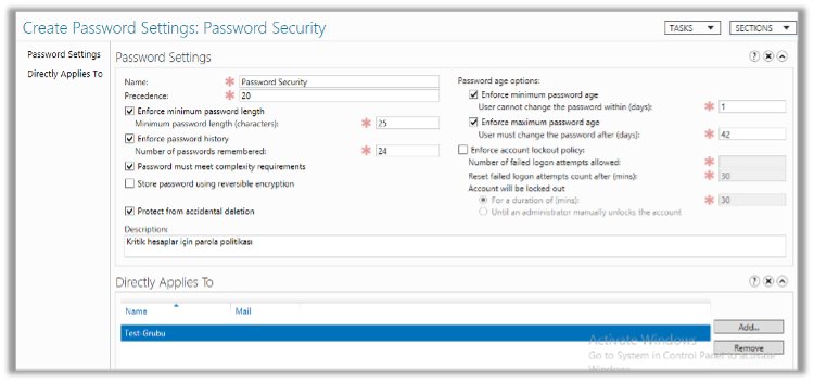 Kurumlarda (servis hesapları gibi) kritik hesapların güvenliği önemlidir. Bu hesapların bir security group altında toplanması ve bu gruba özel olarak oluşturulacak bir parola politikası uygulanması tavsiye edilmektedir.